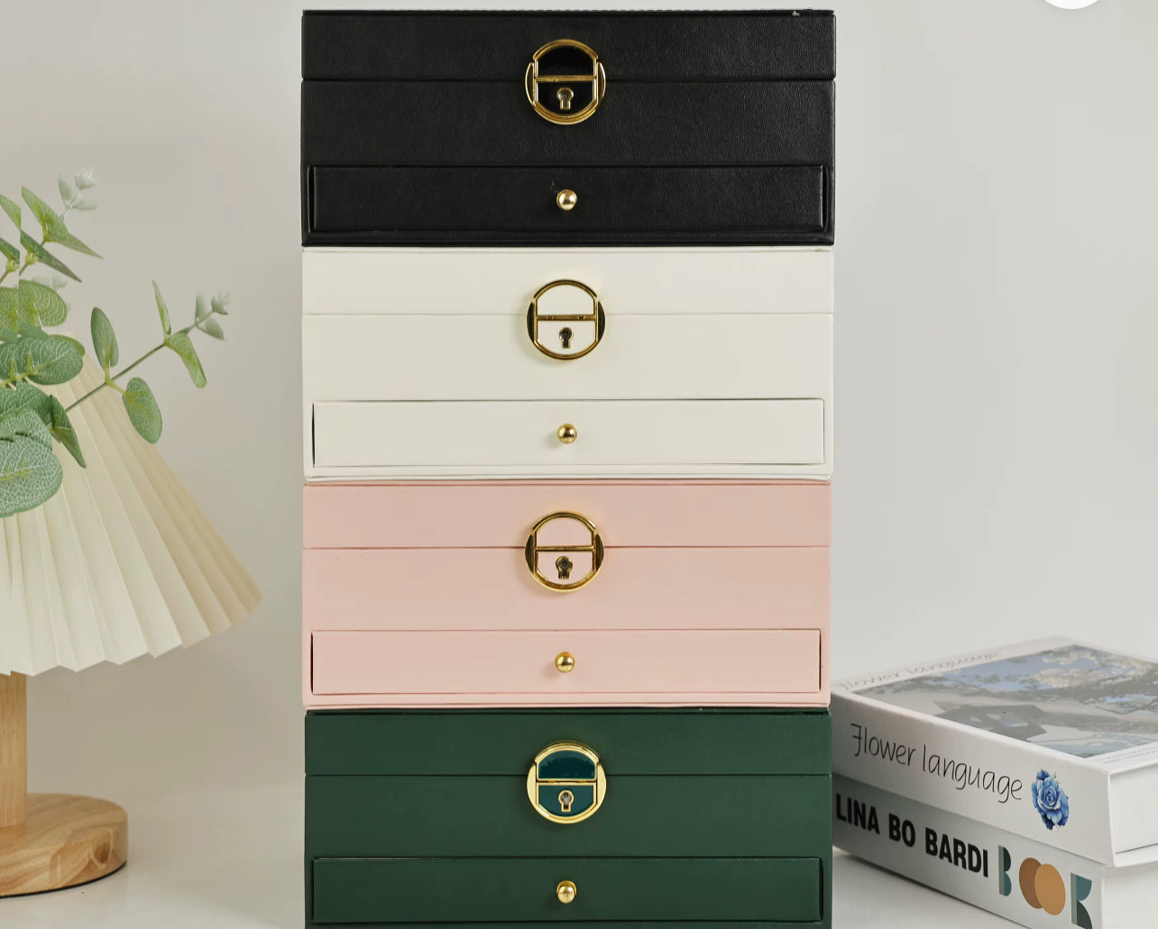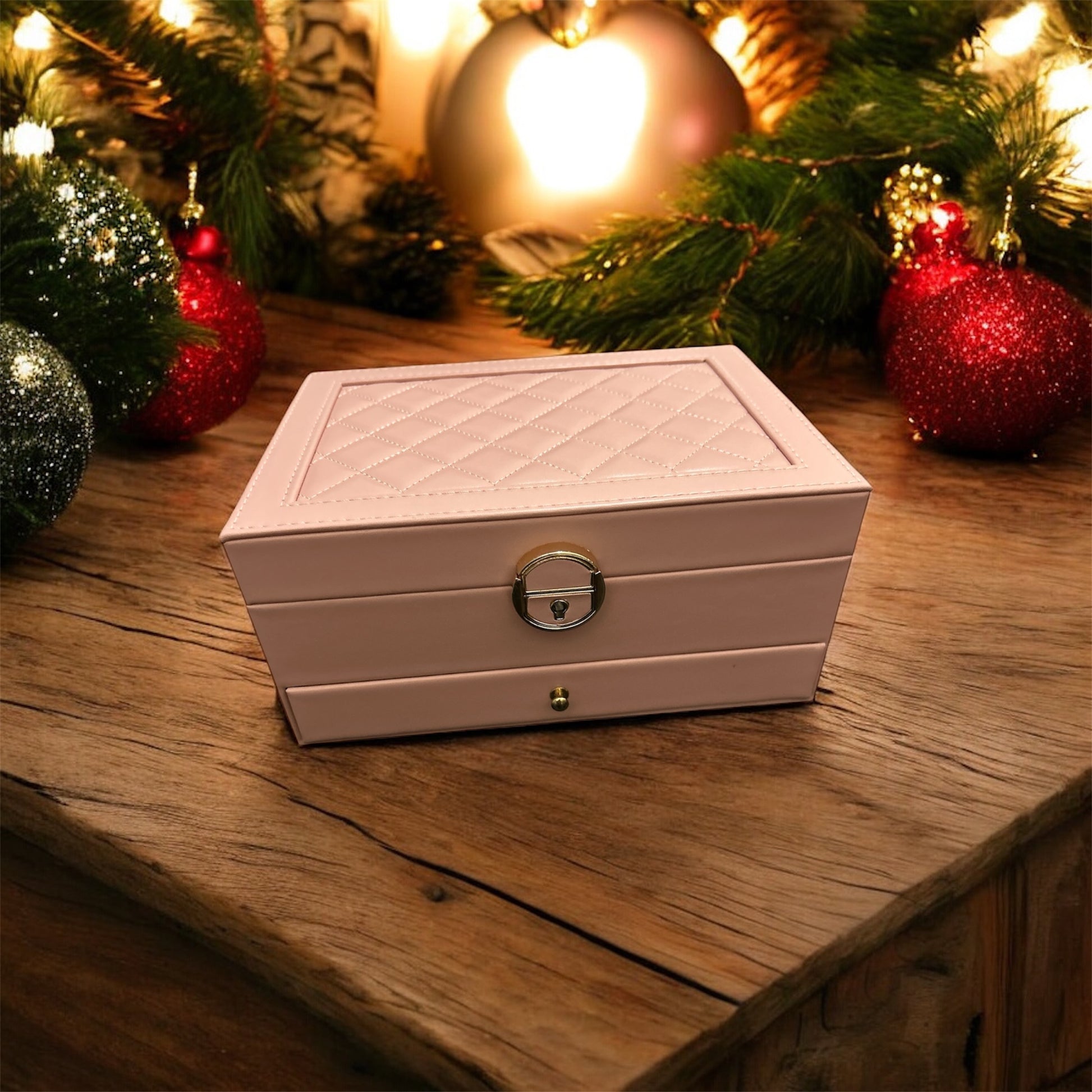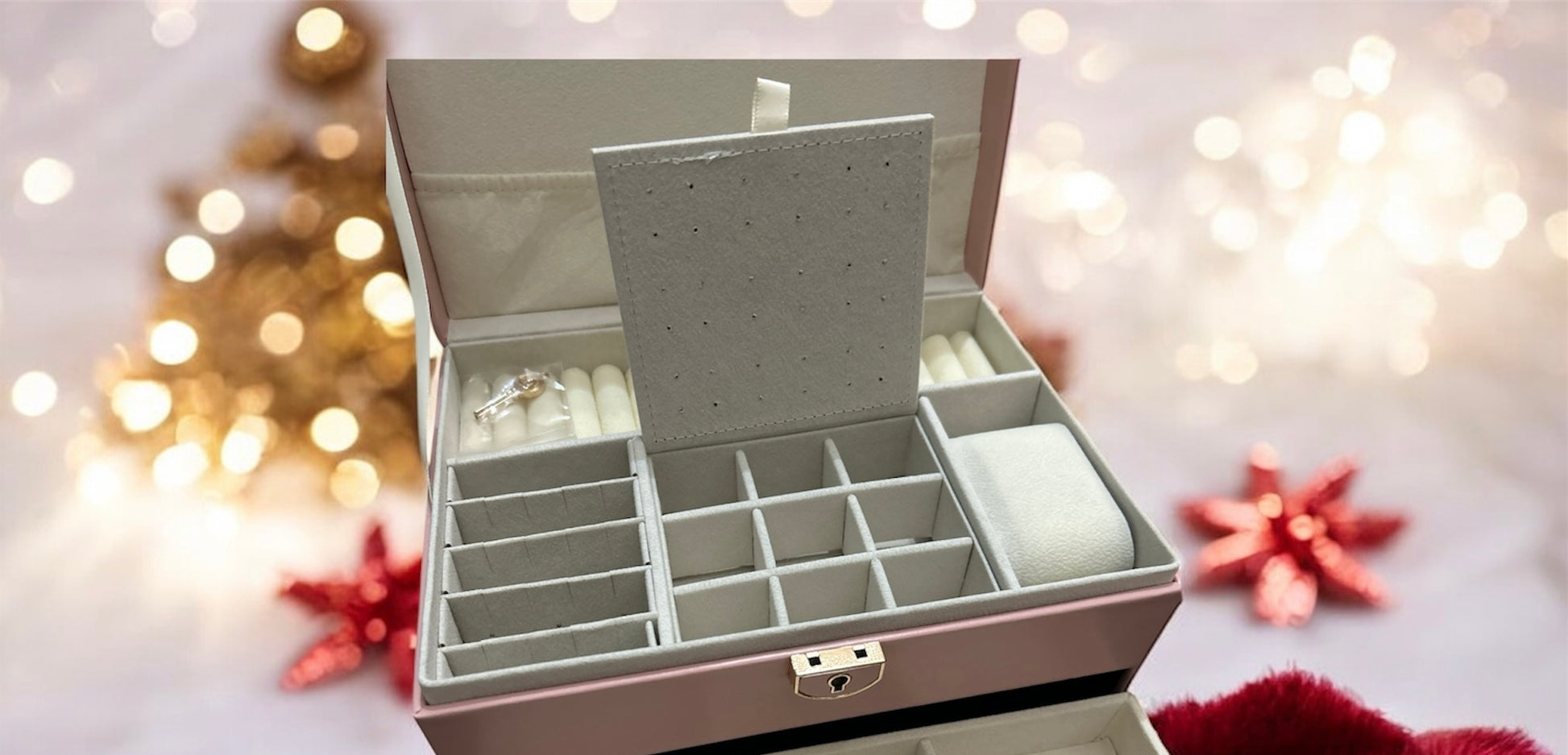 Un portagioie a due strati, con porta anelli, orecchini, collane e bracciali, ed un comodissimo cuscinetto semirigido per l'orologio.